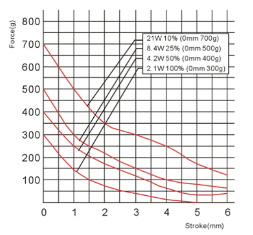 縱向:代表電磁鐵在對應(yīng)行程時的力量   單位為克(g