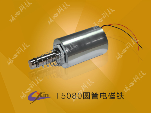 圓管電磁鐵T5080  是磁心科技專為自動化設備定制的一款推拉式電磁鐵,產品的整體結構為圓管型,可根據客戶的需要焊接支架。圓管式電磁鐵T5080直徑為50mm,高度為80mm,行程可以達到30mm以上,力量可以做到8KG以上。